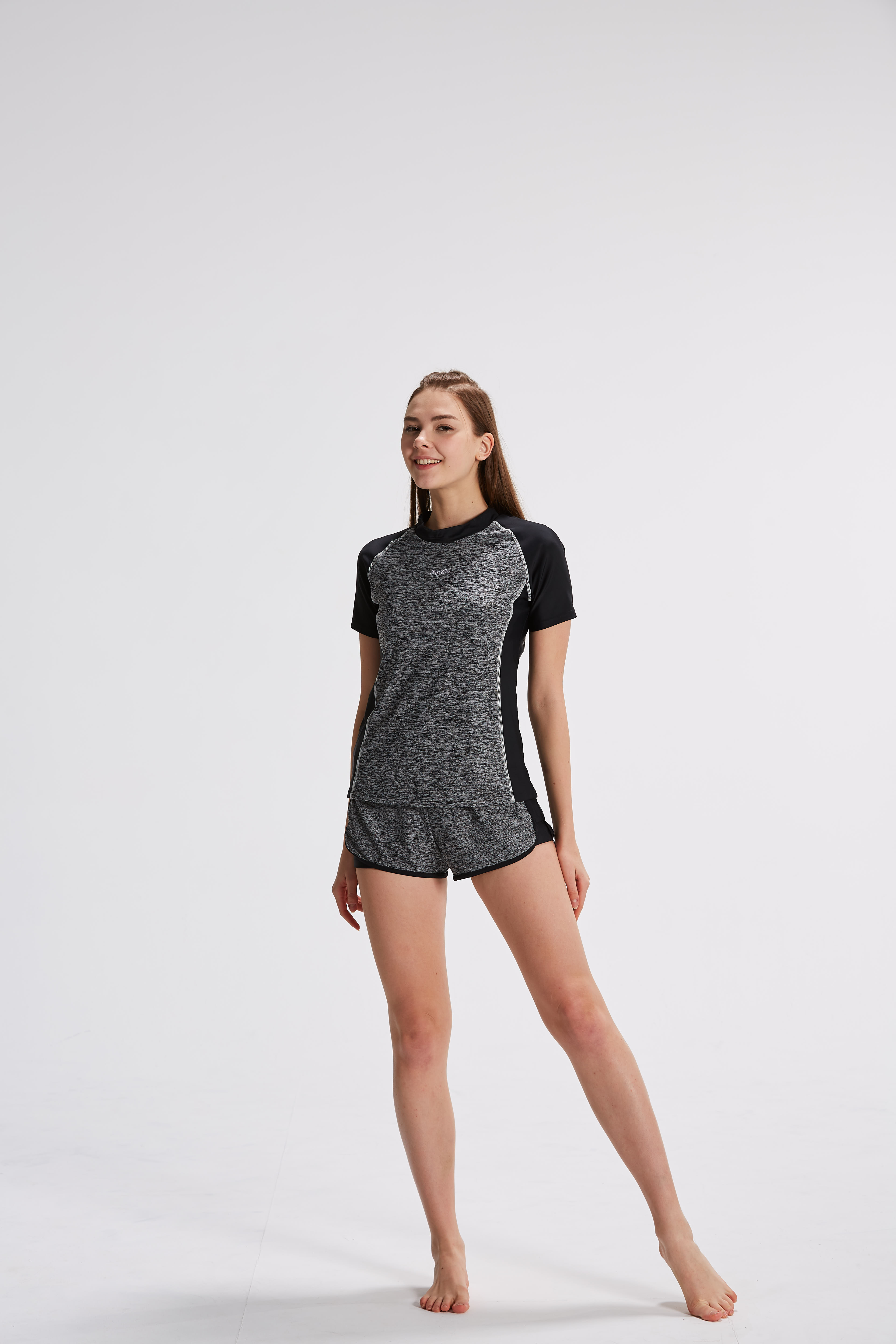 ▸內容物:黑灰(麻花布)拼接上衣x1+黑灰(麻花布)拼接假兩件式泳褲x1+泳帽x1(附活動式罩杯)